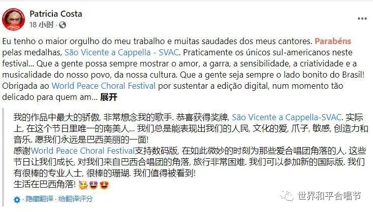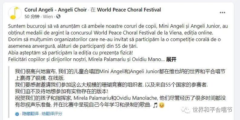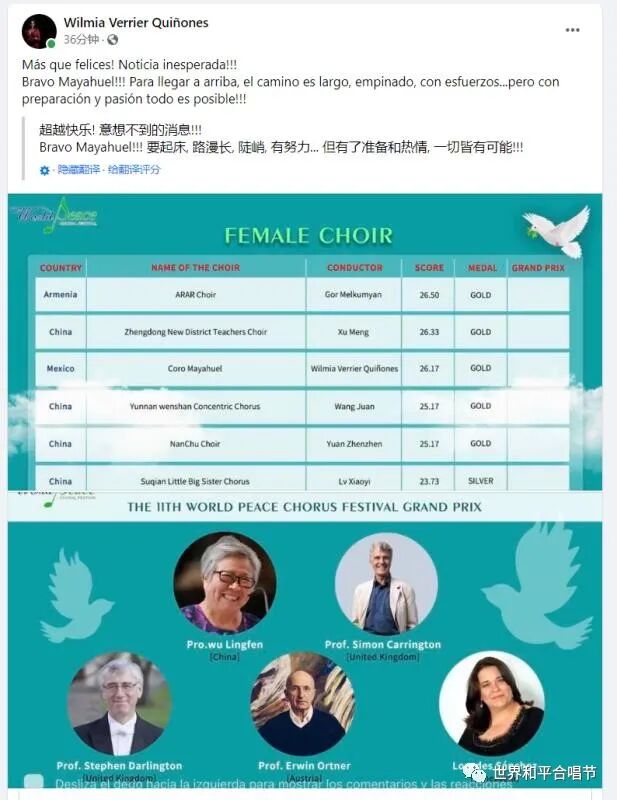 第十一届世界和平合唱节圆满闭幕,期待明年再相聚!![]() 世界和平合唱节(The World Peace Choral Festival,简称:世和节)是全球首个以和平为主题、由世界范围内热爱音乐、倡导和平的团队参加的大型国际合唱交流盛会。 世界和平合唱节作为当今世界上最重要的合唱节之一,起源于世界著名的奥地利国宝、世界非物质文化遗产维也纳童声合唱团对和平的倡导,由维也纳童声合唱团现任主席兼艺术总监杰拉尔德·维尔特教授担任艺术委员会主席。受到了联合国维也纳总部、奥地利联邦政府、维也纳市政府、世界合唱联盟、中国合唱协会等组织和机构的大力参与和支持,得到了世界各国人民的高度关注。 2020年,一场席卷全球的疫情给世界带来了前所未有的冲击,面对人类共同的挑战,和平与团结成为疫情下国际社会的共同呼声。2021年第十一届世界和平合唱节,延续“为歌唱而来,为和平而歌”的主题,于2021年1月全面启动。让我们乘着歌声的翅膀,飞向梦的远方! 2021年6月12日晚,第十一届世界和平合唱节云闭幕音乐会隆重举行,至此,5月22日至6月12日为期22天的合唱盛会圆满落下帷幕。本届世界和平合唱节活动期间开展了云开幕音乐会、云展播音乐会、线上大师班、公开赛、大奖赛、和平之声音乐会、和平义演、云闭幕音乐会等活动内容,共计实现了17场音乐会线上播出。播出平台包含央视频、音乐大师学院、新浪微博、腾讯视频、哔哩哔哩、Youtube、Facebook等各大媒体、平台云上播出。强大多元的直播互动阵容,令各国热爱音乐的朋友们都能够尽情欢唱与欣赏。 云闭幕音乐会与全球所有热爱合唱音乐的朋友们,共同回顾了本届合唱节的精彩历程,一起欣赏南非斯泰伦博斯大学合唱团、捷克童声合唱团、英国剑桥圣约翰学院合唱团、英国天使之翼合唱团、法国巴黎圣十字童声合唱团、西班牙Leioa Kantika Korala、美国声乐表演合唱团、俄罗斯春天合唱团、乌克兰彩色合唱团等世界各国合唱团的绝佳演出。伴随着动听地歌声,第十一届世界和平合唱节圆满闭幕,为世界呈上了“合唱之美”的美丽篇章! ![]() 南非斯泰伦博斯大学合唱团 ![]() 英国天使之翼合唱团 ![]() 英国剑桥圣约翰学院合唱团 为歌唱而来,为和平而歌!本届世界和平合唱节吸引了55个国家和地区、超过340支合唱团共同参与,是一次全球合唱的大联欢。奥地利、中国、美国、南非、英国、德国、亚美尼亚、西班牙、南美国家等合唱大国均有众多代表团队参与到活动中,掀起了各国人们热爱合唱的阵阵浪潮,国际文化合唱在此得到了亲切交流和深度交融。每支合唱团用一首首悠扬之乐,宛若天籁般的歌声谱写和平篇章。 第十一届世界和平合唱节云开幕音乐会汇集了30支国际顶尖合唱名团,几乎囊括了当代合唱音乐从传统经典到热门流行的杰出诠释团队,他们亦以极高水平的指标性演绎,凝聚不同样貌的音乐能量,联袂上演了一场非同凡响的“合唱盛宴”。 ![]() 智利Voces Reunidas ![]() 波兰波兹南男童合唱团 ![]() 立陶宛Liepaites合唱团 先进的教学理念,生动形象的示范课,秉承歌唱的初心,直达内心教学的线上大师班,国际著名指挥家、加拿大多伦多大学教授齐菲拉·波洛兹博士,意大利著名合唱指挥家、国际合唱联盟杂志主编安德烈·安吉里尼教授,国王歌手合唱团创始人、美国耶鲁大学教授西蒙·卡林顿博士,牛津大学教授斯蒂芬·达林顿博士,维也纳童声合唱团主席及艺术总监杰拉德·维尔特教授担任本届世界和平合唱节主讲,让各国合唱指挥及团员们进一步了解合唱、认识合唱、感受合唱的魅力。 本届和平义演环节在线上举办,所有参加义演的合唱团通过线上音乐会为联合国儿童基金会捐款。英国Only Boys Aloud、肯尼亚男童合唱团、乌克兰彩色合唱团、法国巴黎圣十字童声合唱团、俄罗斯春天合唱团轮流呈上精彩绝伦的演出节目,为观众送上一场视听盛宴,将健康向上的人文艺术推向高潮。 ![]() 英国Only Boys Aloud ![]() 肯尼亚男童合唱团 而备受大家期待的云比赛环节,牵动着全体参赛团员的心。本届世界和平合唱节大赛制度分为公开赛及大奖赛,公开赛吸引了来自32个国家的251支合唱团共同参与,11个组别,吴灵芬教授领衔37位国际顶级专家评审组成的评审团进行评审,最终诞生14支团晋级大奖赛。 01 公开赛童声I 组金奖前三名
