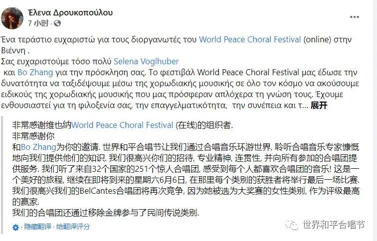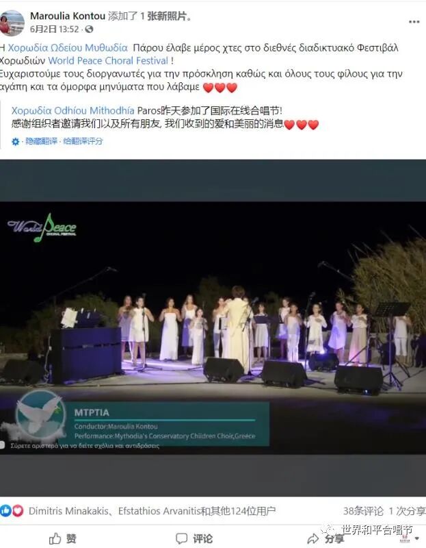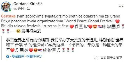 晋级大奖赛团队包括亚美尼亚小歌手合唱团、菲律宾曼达维儿童青少年合唱团、中国内蒙古艺术剧院合唱团、西班牙马德里青年合唱团、亚美尼亚格加尔德合唱组合、中国广州荔湾童声合唱团、中国杭州采荷第二小学教育集团“乐飞扬”合唱团、中国兰州市安宁区教师合唱团、中国再见动物园合唱团、中国肇庆市端州海韵童声合唱团、保加利亚博德拉佩森合唱团、希腊贝尔坎特女生合唱团、德国奥勒留男孩合唱团、中国湖北省黄石市爱乐合唱团。参与比赛的团队进行了作品展播,开展了9场云展播音乐会播出,累计观看人数达到数百万。 ![]() 亚美尼亚小歌手合唱团 ![]() 菲律宾曼达维儿童青少年合唱团 ![]() 中国内蒙古艺术剧院合唱团 ![]() 西班牙马德里青年合唱团中国 ![]() 亚美尼亚格加尔德合唱组合 ![]() 中国广州荔湾童声合唱团 ![]() 中国杭州采荷第二小学教育集团“乐飞扬”合唱团 ![]() 中国兰州市安宁区教师合唱团 ![]() 中国再见动物园合唱团 ![]() 中国肇庆市端州海韵童声合唱团 ![]() 保加利亚博德拉佩森合唱团 ![]() 希腊贝尔坎特女生合唱团 ![]() 西班牙马德里青年合唱团 ![]() 中国湖北省黄石市爱乐合唱团 通过顶级专家的权威评审,大奖赛成绩揭晓:最终亚美尼亚小歌手合唱团获得大奖赛第一名、菲律宾曼达维儿童青少年合唱团获得大奖赛第二名、来自中国的内蒙古艺术剧院合唱团和西班牙的马德里青年合唱团获得大奖赛并列第三名,亚美尼亚小歌手合唱团指挥Tigran Hekekyan获颁杰出指挥奖,而民族音乐演唱奖的殊荣,则由中国内蒙古艺术剧院合唱团夺得。一首首经典曲目,通过合唱团队以其独特的艺术表现力和近乎完美的协调、统一、和谐的人声旋律,淋漓尽致展现了合唱艺术风采。 6月7日-6日11日期间,世和节共举办了5场和平之声音乐会,来自6大洲、44个国家超过90支合唱团共同参与,通过部分公开赛金奖团队与优秀展演团队视频展播,每支队伍带来了丰富多彩的节目,感受着来自不同国家的合唱团身着代表自己民族的特色演出服,在歌声的海洋中,让观众们也领略到了不同的风俗文化。有力促进了国际之间的交流,增进了音乐爱好者之间的友谊的同时,把观众带入了一次涤荡心灵的音乐之旅。 ![]() 摩尔多瓦Youth Choir Cantemus ![]() 塞尔维亚HOR ISA-BEG-Choir of Isa-beg Novi Pazar ![]() 爱沙尼亚国家歌剧院男童合唱团 ![]() 法国 100Voices of Gospel ![]() 希腊Canto A Tempo kids choir 用音乐表达对世界和平的美好祝愿。音乐是人类的共同语言。第十一届世界和平合唱节还发起了“中方最具人气合唱团”网络投票,于5月19日拉开序幕,网络投票端口开通即引起广泛关注和积极响应,153支中方合唱团共获得了5871402次点击量,参与投票的总人数为:1772115人,北京市昌平区第二实验小学紫风铃合唱团、浙江传媒学院音乐学院合唱团、西安经开第一学校石榴花合唱团分获榜单第一、二、三名。 2021世和节虽然结束了,但是友谊依旧地久天长,面临当下全球疫情考验,歌唱不会停止,将依然会用纯粹且美好的歌声为世界继续奉上美好祝福。世界和平合唱节也将继续秉承“为歌唱而来,为和平而歌”的理念,向世界上爱好和平与歌唱的每一个人传递“歌唱属于每一个人”的美好宣言,也依然在每年夏季如期而至,异彩绽放。 第十一届世界和平合唱节 受到全球合唱人及媒体的一致好评 ![]() ![]() ![]() ![]() ![]() ![]() ![]() ![]() 由于热情的评语太多,小编就不一一列举了! 线上结束,线下精彩不断。在世界和平合唱节支持下,中国合唱协会的指导下,由世界音乐艺术教育协会与河南省合唱协会联合主办、迈斯特国际、郑州西亚斯学院、北京世音文化承办的2021“庆党百年,唱响中原”合唱美育教育实践交流周将于7月13-15日在河南郑州西亚斯学院举办。交流周将邀请来自全国各地的优秀合唱团、多家参展商,并会同中国数百名合唱音乐人参与开展合唱大师班、合唱建设研讨会作为合唱美育交流周的主体部分。交流周活动将分成不同环节,包括:主题专场音乐会、合唱指挥大师班、名师一对一指导合唱团、合唱美育教育实践座谈会、艺术展厅(合唱作品售卖、合唱周边商品展销)、闭幕式盛典音乐会等活动。其中合唱指挥大师班将由世界和平合唱节评委会主席吴灵芬教授领衔,中国合唱届领军代表:陈家海、阎宝林、周宝全、徐亮亮、温雨川、邓卓锐联合开展,阵容强大、实操性强,让合唱的学习有效,让合唱的进步可见,让合唱的连接无处不在。期待七月,河南,与你再次“豫”见! *云闭幕音乐会近期将于音乐大师学院、央视频、腾讯视频、bilibili网络媒体进行限时回放,敬请关注各平台【世界和平合唱节】官方账号。 *点击以下链接了解交流周详情 -END- - 第十一届世界和平合唱节 - 精彩回顾 ![]() ![]() ![]() ![]() ![]() ![]() ![]() ![]() 点击可查看更多 ![]()