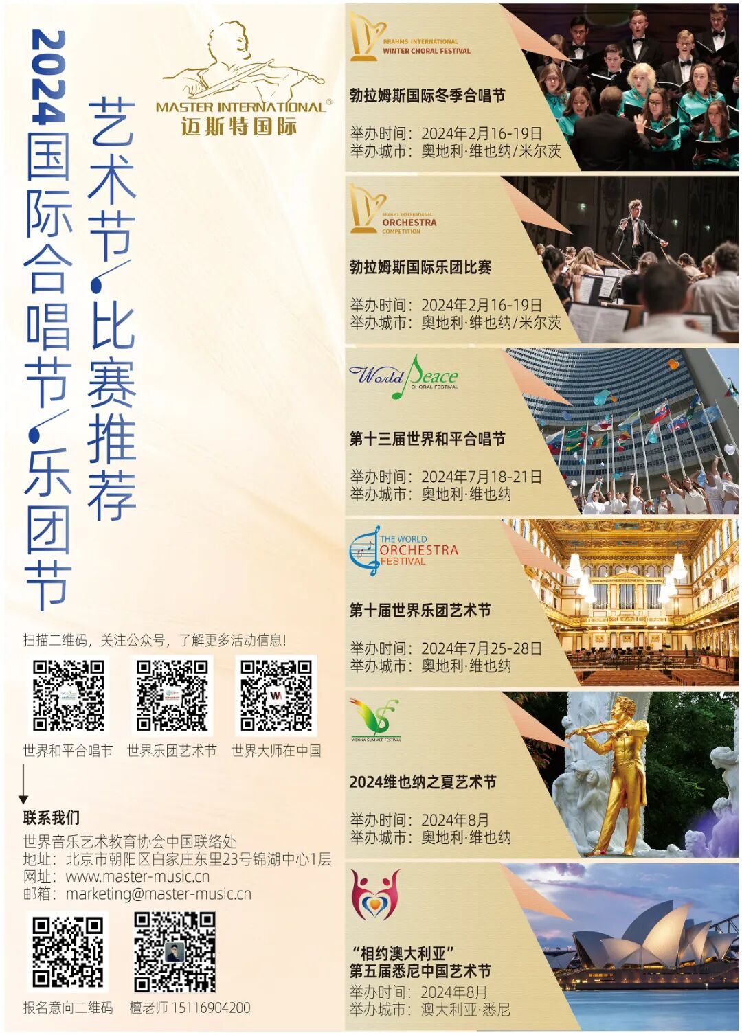 ![]() ![]() 【重要信息】 为了让每一支参与合唱团 有更好的参与体验和艺术收获! 全国仅限20支参与名额,满额即止! 2024年暑期恰逢在巴黎举办 第33届夏季奥林匹克奥运会, 届时赴欧人员激增; 请意向参与合唱节的团队及早报名, 确定行程,提前准备出国相关手续。 预报名费:1000元人民币/人(含在总费用里) 限时优惠:11月15日前,预报名费优惠500元人民币/人(11月15日后增加人员不享受此优惠) 报名截止时间:2024年2月1日前截止报名(名额有限,仅限全国20支合唱团,满额即止) 2024世和节 7.18-21 2024第十三届世界和平合唱节 活动相关细则及接待标准请咨询 檀老师 15116904200 报名邮箱:marketing@master-music.cn 世界和平合唱节中国联络处 ![]() ![]() 这里是闻名世界的音乐之都 美丽的多瑙河像五线谱般缓缓流淌 这里是音乐大师的故乡 天才在这里成就梦想 这里是音乐人筑梦的天堂 让无数怀抱音乐梦想的人心生向往 明年夏天,全世界不同国家的合唱团 齐聚世界音乐之都-维也纳 共同欢唱和平的赞歌