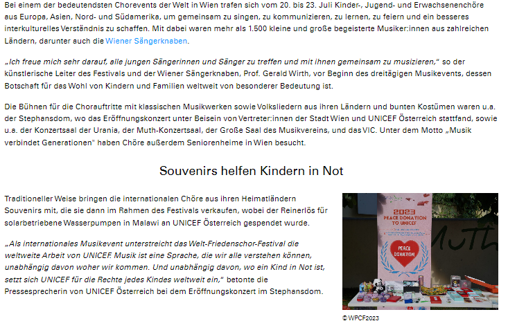 报道指出,由于疫情中断了三年,第12届世界和平合唱节于7月份在维也纳再次举行。来自世界各地的合唱团带来传统纪念品,进行义卖活动,为马拉维的太阳能水泵筹集善款。 ![]() 世界和平合唱节被认为是世界上最重要的合唱活动之一,在7月20日至23日期间,来自欧洲、亚洲、北美洲和南美洲的儿童合唱团、青少年合唱团和成人合唱团聚集一堂,共同歌唱、交流、学习和展演,促进了不同文化之间更好的相互理解。来自不同国家的1,500多名充满激情的音乐爱好者参加了这一盛会。在为期三天的音乐活动开始之前,维也纳童声合唱团的艺术总监Gerald Wirth教授表示:“我非常期待与所有年轻的合唱团员见面,并与他们一起同台演出。合唱节对于全球儿童和家庭福祉非常重要,具有特殊意义。” 报道中提到的,世界和平合唱节活动在多个场地上展开,合唱团成员身着绚丽多彩的演出服装,在舞台上歌唱。演出曲目涵盖了古典音乐作品和各国民歌,让观众们享受多样的音乐风格。其中,开幕音乐会在圣斯蒂芬大教堂举行,维也纳市政府和联合国儿童基金会奥地利分会的代表出席了开幕式。其他的演出地点包括Urania皇家天文观星台、沃蒂夫皇家教堂、MuTh音乐厅、圣利奥波德教区教堂等。此外,在“音乐传递孩子对老人的温情”的主题下,合唱团还专程前往维也纳的养老院,为老人们献上动人的演出,用音乐温暖他们的心灵。 ![]() ![]() ![]() 报道尤其赞扬了第12届世界和平合唱节为联合国儿童基金会进行的义卖活动。按照传统,各国合唱团带来了自己国家的特色纪念品,在合唱节期间进行义卖,所筹款项将捐赠给联合国儿童基金会奥地利分会,用于马拉维的太阳能水泵项目。联合国儿童基金会奥地利分会的发言人在圣斯蒂芬大教堂的开幕式音乐会上发表了演讲,她表示:“作为一项国际音乐盛事,世界和平合唱节展现了联合国儿童基金会为全球做出的贡献。音乐是我们共同的语言,无论我们来自何方,无论贫困的儿童身处何地,联合国儿童基金会都致力于保护每个孩子的权益。” ![]() ![]() 在维也纳的标志性建筑圣斯蒂芬大教堂的演出同时,全球数以百万计的儿童和他们的家庭正面临着气候变化所带来的威胁。干旱、洪水以及水源污染的传播都对他们的生命构成了严重威胁。 非洲许多地区,包括世界上最贫穷的国家之一马拉维,地下水位近期急剧下降。在这些地方,霍乱威胁着数以百万计儿童的生命。然而,通过太阳能水泵的使用,我们可以将水井钻得更深,为今后的供水问题提供长期解决方案。获得清洁的水不仅对人类的生存至关重要,而且对于儿童的教育也是基础。特别是对于女童来说,她们无需每天花费几个小时从遥远的地方取水,可以有更多时间去学习。 联合国儿童基金会的合作伙伴们表示致力于打造更美好的未来。基金会在全球约190个国家开展工作,涵盖教育、食品、水与卫生、儿童保护、健康、性别平等、儿童权利和紧急救援等领域。他们通过改善基础设施、提供救援物资以及创新实地工作方式为儿童做出贡献。各国政府高度重视联合国儿童基金会的专业方法,帮助改善儿童的状况,并在立法层面采取行动。基金会不仅关注个体儿童的需求,也帮助整个地区和国家。 报道的最后再次介绍了世界和平合唱节。自2010年创办以来,来自60多个国家的合唱团参加了这一盛会,得到了维也纳童声合唱团等众多合唱团的大力支持。世界和平合唱节的艺术总监Gerald Wirth教授同时也是维也纳童声合唱团的艺术总监表示:经历了三年疫情的间断后,今年参加合唱节的合唱团再次在世界音乐之都维也纳为世界和平树立了重要榜样。 ![]() 第十二届世界和平合唱节的圆满举办备受瞩目,引起了联合国儿童基金会、维也纳市政府网等媒体的广泛关注。他们格外赞扬了活动中举行的和平义卖活动所蕴含的深远意义,并为参与此项和平事业的合唱团队颁发证书表示感谢,感谢他们将音乐与慈善相结合,为世界和平贡献出独特的力量。通过和平义卖,人们以实际行动支持和平事业,用爱心和温暖帮助那些需要关怀的儿童。这不仅是一场音乐盛宴,更是一次跨越国界、跨越文化的友谊之旅。第十二届世界和平合唱节,用音乐荡涤心灵,用爱心传递和平,将我们紧密团结在一起,共同创造一个更加美好的世界!2024年7月18-21日期间,第十三届世界和平合唱节将继续举办和平义卖活动,携手联合国儿童基金会,为需要帮助的人们献上爱心和温暖,参与和平义卖的团员们将获得联合国儿童基金会颁发的表彰证书!期待第十三届世界和平合唱节我们再相遇!