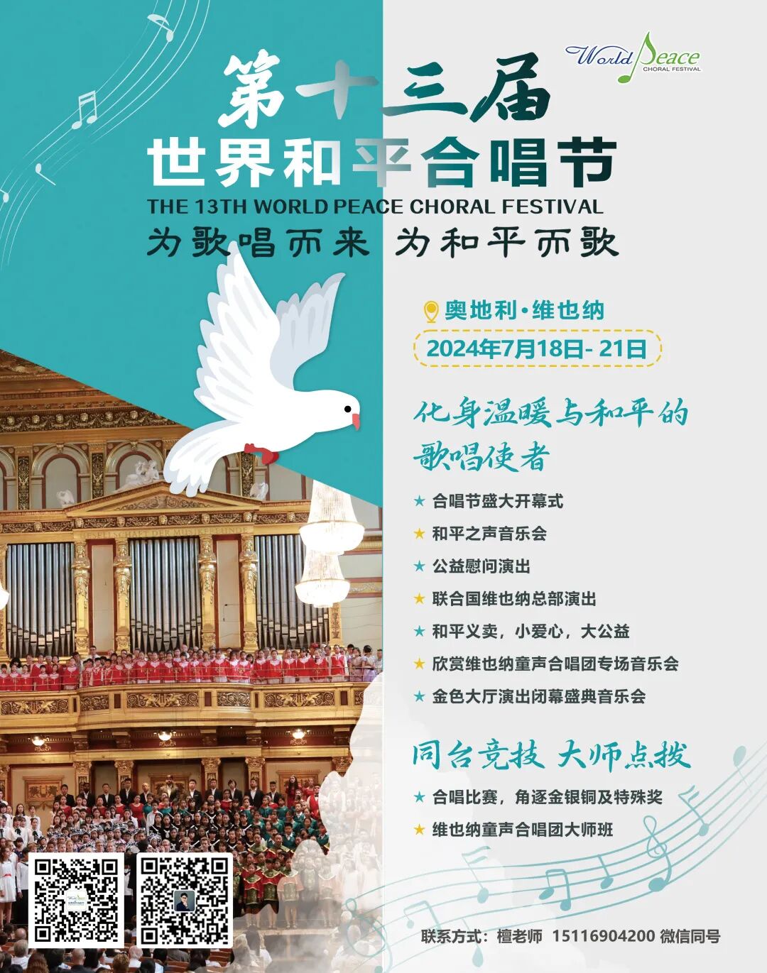 世界和平合唱节,向大家送上最诚挚的祝福,祝愿大家度过一个充满欢笑和温暖的春节!新的一年,让我们以音乐相伴,愿所有的心愿与梦想都得以实现,带来幸福与成功。祝福大家春节愉快! ![]() 为歌唱而来 为和平而歌 第十三届世界和平合唱节 齐聚维也纳 共同欢唱和平的赞歌! 点击下方海报,了解更多活动内容! ![]()